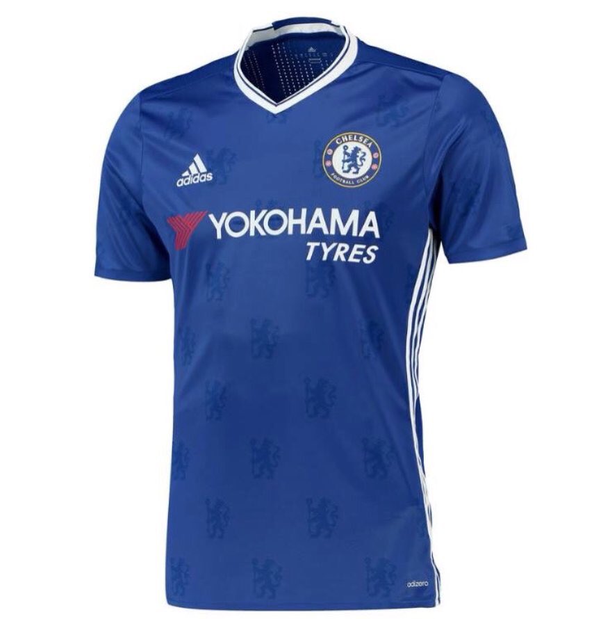 The home kit is traditional blue with the design featuring the Chelsea lion as a watermark embossed across the entire front body of the kit. The Adidas stripes run down the sides with the v-neck collar in white.