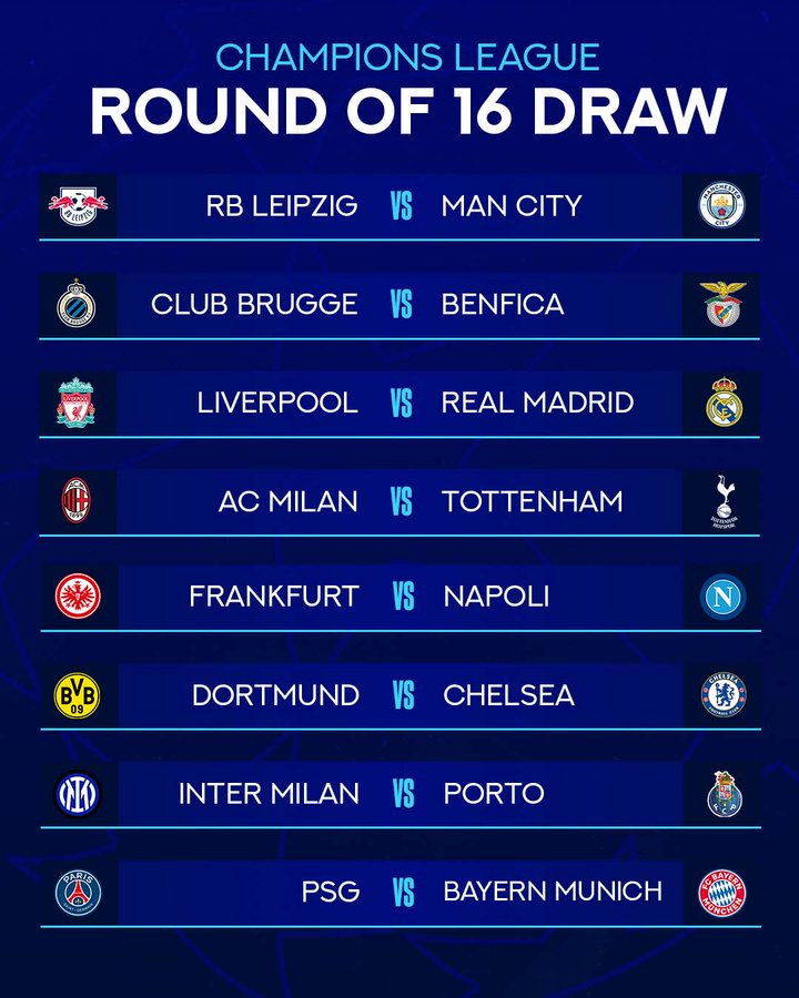 The draw for the last-16 knockout phase of the Champions League has been conducted today with Liverpool, Chelsea, Man City and Tottenham all learning their fate.