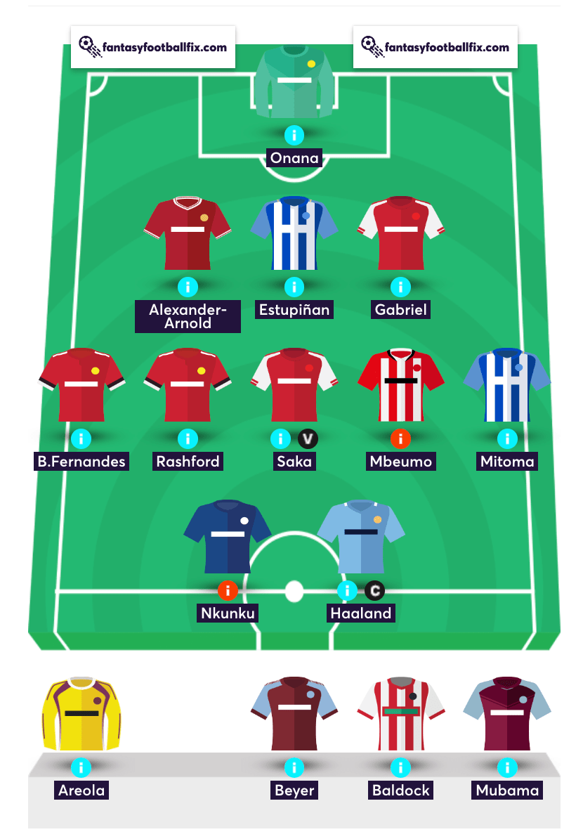 Up top and you won’t be surprised to see Erling Haaland (£14.0m) with the captain’s armband. Haaland is in every single one of our Elite XI managers’ squads despite his price hike. At 86.8% owned, you would be a brave – or [insert a less-flattering term here] – FPL manager to go against him!