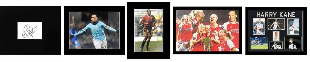 Football Autographs and Signed Photos – L-R: Mike Phelan (Man Utd) Autograph £7.99, Signed Carlos Tevez Photo (Man City) £59.99, Signed Viv Anderson Photo £31.99, Signed Beth Mead (Arsenal) £79.99, Signed Harry Kane display (Spurs/England) £399.99