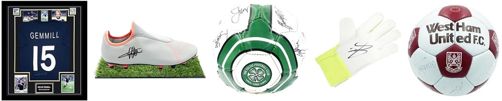 Signed Football Memorabilia – L-R: Signed Archie Gemmill shirt £239.99, Signed Jermain Defoe boot (Spurs/England) £199.99, Signed Celtic Football £449.99, Signed Jordan Pickford glove (England) £239.99, Signed West Ham Ball £279.99.