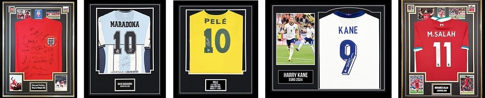 Signed Football Shirts L – R: Signed England 1966 Shirt £3999.99, Signed Maradona shirt £2,799.99, Signed Pele shirt £599.99, Signed Harry Kane Shirt £799.99, signed Mo Salah shirt £1999.99
