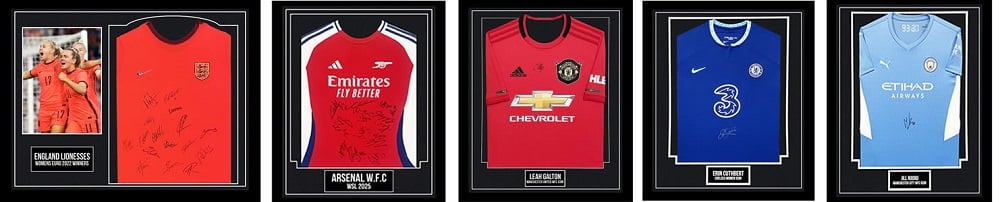 Signed Lionesses 2022 shirt £1,399, Arsenal 2025 Shirt £799.99, Signed Leah Galton Shirt (Man Utd) £299.99, Signed Eric Cuthbert shirt (Chelsea) £349.99, Signed Jill Roord shirt (Man City) £349.99 – Firma Stella©