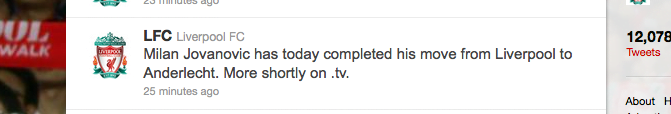 The move brings to an end a disappointing spell at Anfield for the Serbian. Liverpool are expected to make the news official on www.liverpoolfc.tv shortly, but perhaps more clubs will begin to make official announcements through social networking sites in the future.