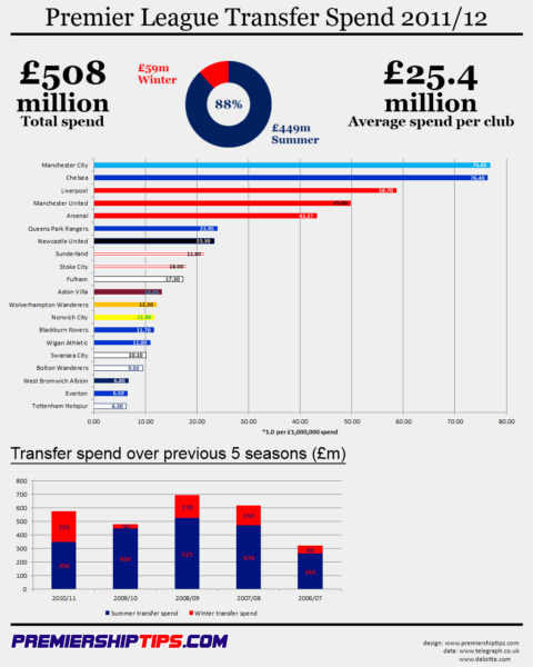 Here’s an infographic that illustrates the transfer spend of all 20 Premier League clubs during the summer 2011 & January 2012 transfer windows. Very informative