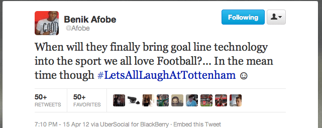 While Afobe joined in the calls for goal line technology, he followed it up with “in the mean time though #LetsAllLaughAtTottenham”